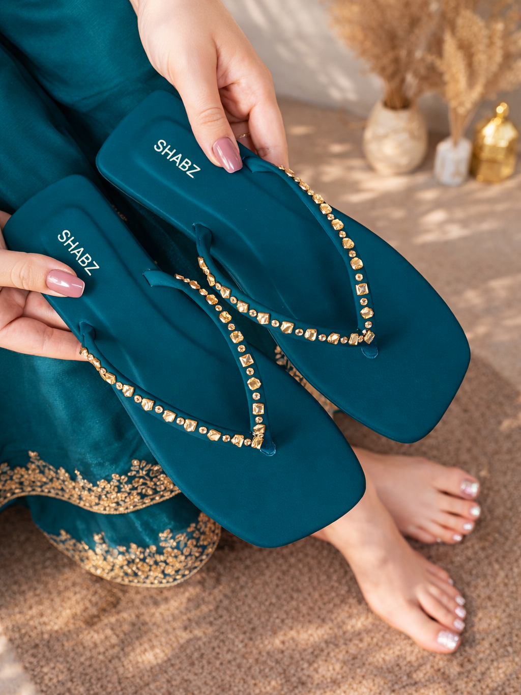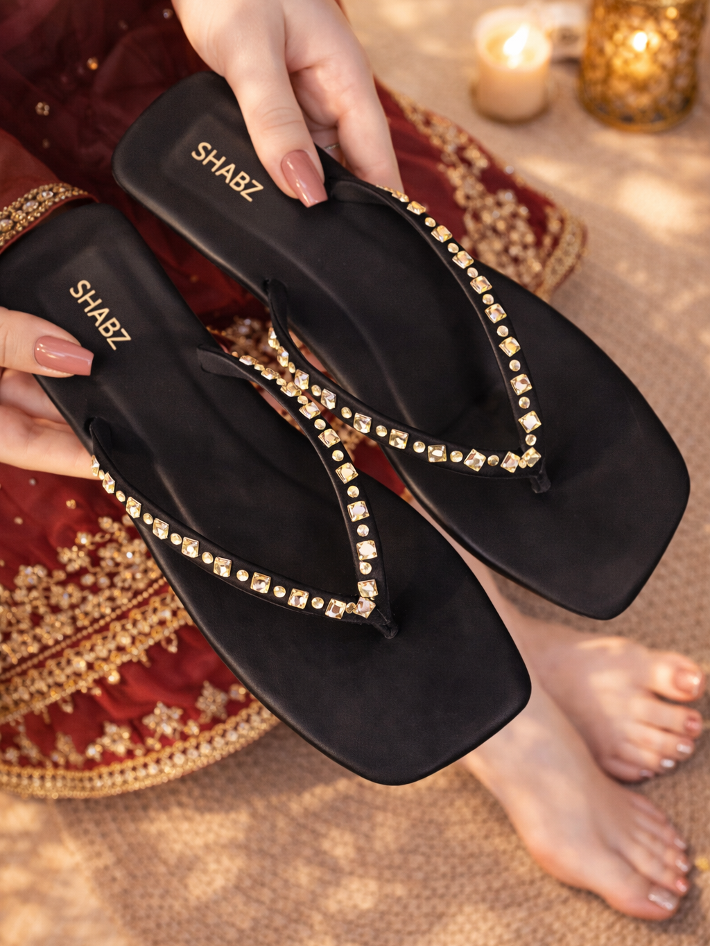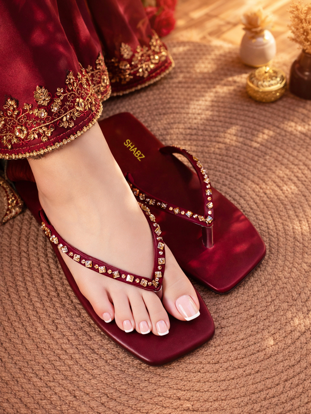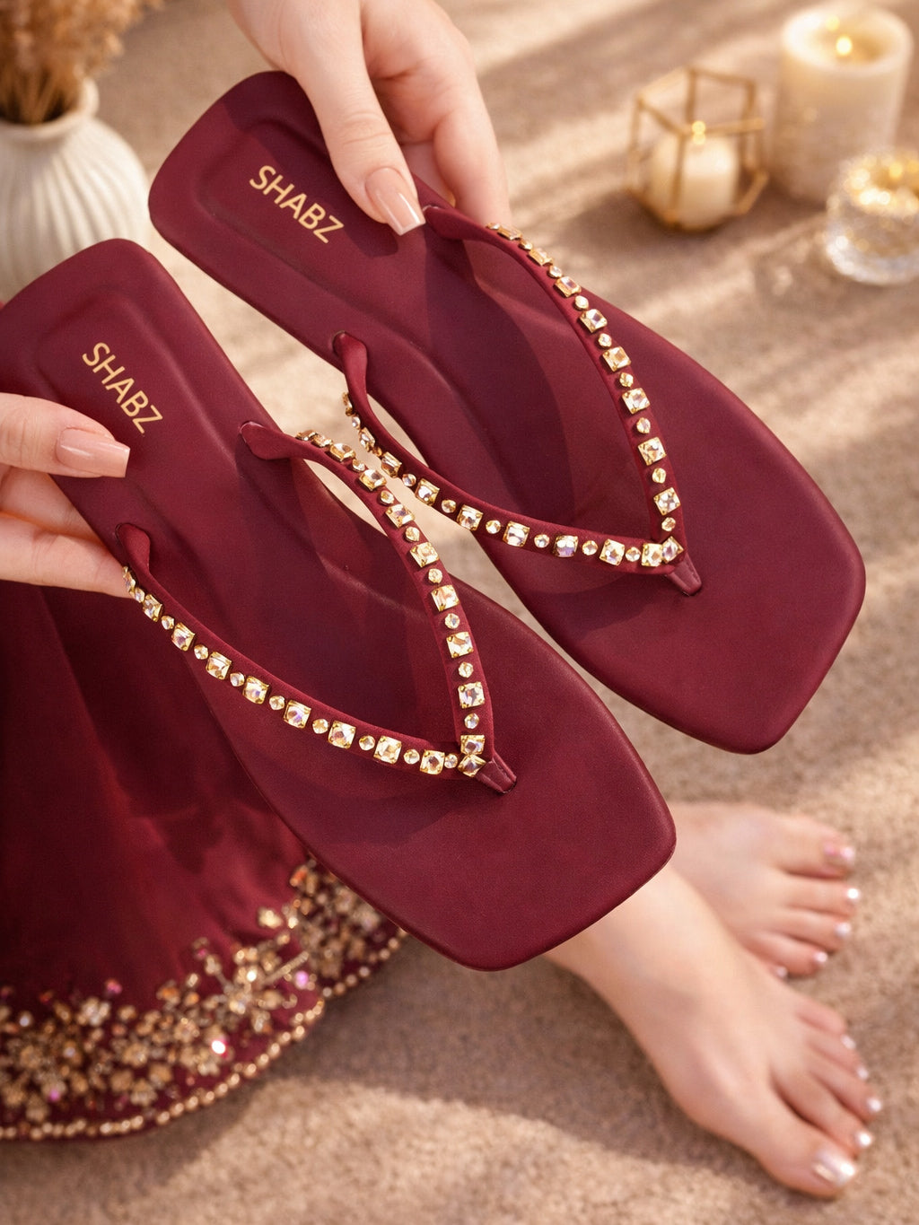 Make every step sparkle with our Crimson Tide flip-flops, adorned with elegant champagne stone work on a chic square-toe design. Built with double cushioning for superior comfort and a lightweight, slip-resistant sole, these sandals are perfect for summer parties, beach vacations, and stylish everyday wear. A bold color, luxurious details, and all-day comfort make them a must-have for your summer wardrobe.
