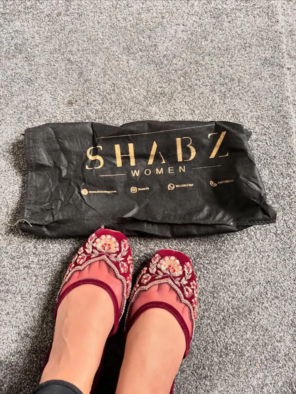 A beautiful Maroon Velvetl serves as a canvas for this exquisite scallops design. These tilla, naqshi, zardozi, moti, sitara & chain details with a sheer scallop detailing. This jutti is a fit for all. It can be styled any outfit alike.
